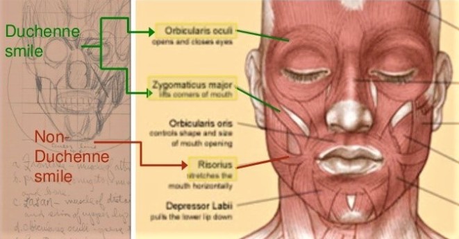 Duchenne comprobó que había otro músculo que se activaba el músculo orbiculcar de los ojos y el Cigomático mayor que está alrededor de los ojos. Este músculo tiene la característica que no puede ser controlado de manera consciente.